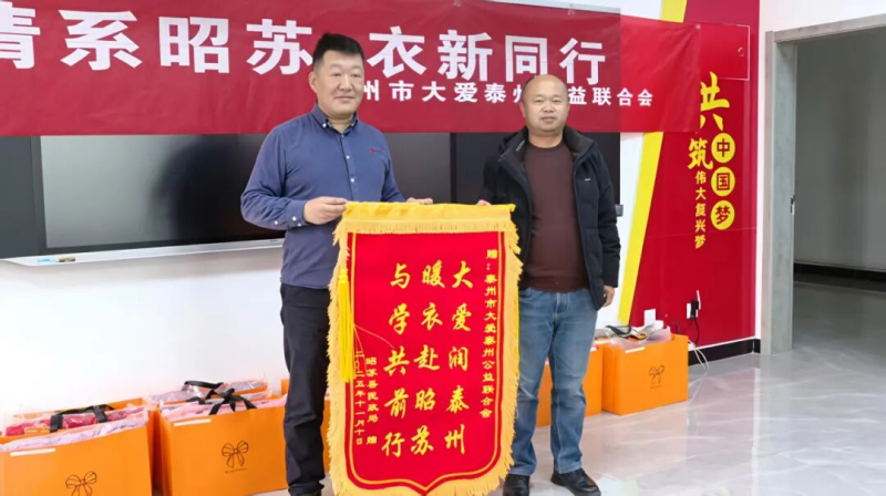 活动现场暖意融融,泰州市公益组织许晓峰为困难学生代表现场发放了崭新的羽绒服。孩子们接过饱含爱心的衣物,脸上洋溢着灿烂的笑容。昭苏县相关部门为大爱泰州公益联合会赠送锦旗,感谢其对昭苏县公益事业的大力支持。