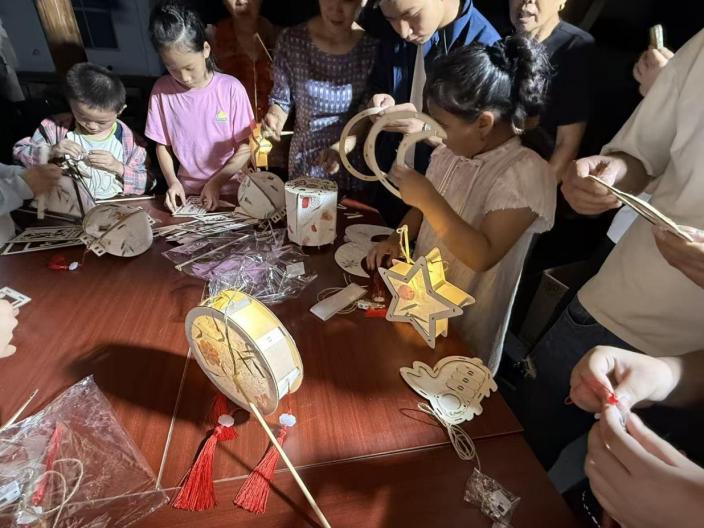 邻里互动庆月圆,各族同心促团结。活动现场还特别设置“同心夜话”环节和“手作非遗”区域。在暖黄灯光的映照下,各族群众围坐一圈,分享美味茶点,交流民族风俗,邻里情谊在欢声笑语中不断升温。而一旁,花灯手作、灯谜竞猜、投壶比赛等趣味非遗体验活动吸引了各族群众的踊跃参与。由懂非遗、擅手工的民族同胞担任手作区域各个点位的“主理人”,带领大家在动手和动脑中感知中华优秀传统文化的深厚底蕴和独特魅力。乡村夜晚宁静安详,活动现场却热闹非常,一盏盏精美的花灯、一声声热烈的抢答、一次次专注的投掷,不仅拉近了各族群众的距离,也温暖了各族群众的心间。