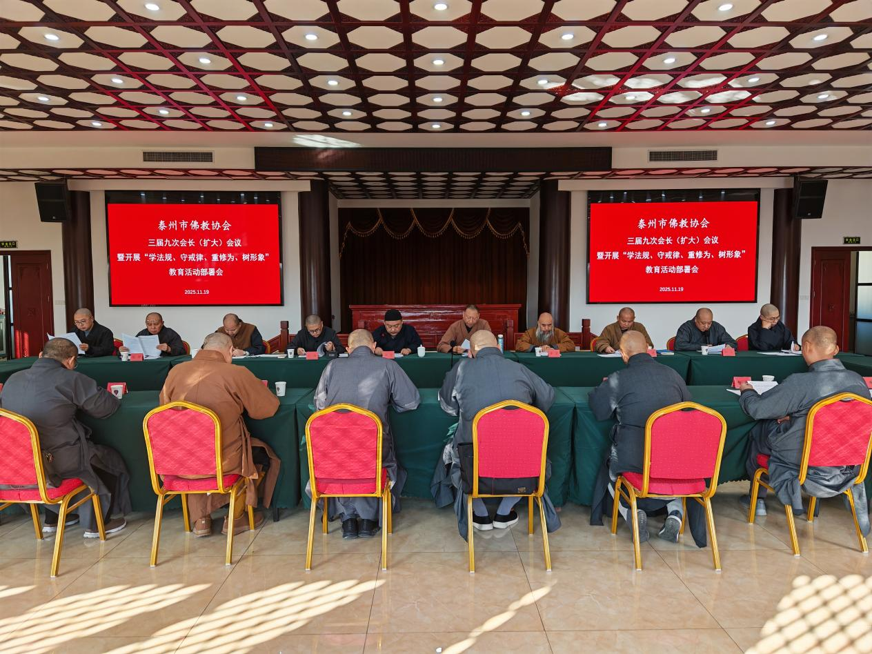 2025年11月19日,泰州市佛教协会召开三届九次会长(扩大)会议暨开展“学法规、守戒律、重修为、树形象”教育活动部署会。市佛协副秘书长及以上人员参加会议,市民宗局相关处室人员列席会议。会议由市佛协会长法空主持。