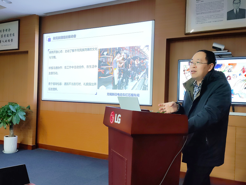 泰州市民宗局民族处负责人张振宁以《铸牢中华民族共同体意识 促进企业团结》为题作专题讲座,重点围绕民族基础知识、新思想新观点新方法、做好企业民族工作三个方面,对中央和省委民族工作会议精神进行了深刻解读,紧扣铸牢中华民族共同体意识这条主线,引导各民族员工在企业大家庭中牢固树立正确的祖国观、民族观、文化观和历史观,增进文化认同;按照促进各民族交往交流交融的要求,引导LG扎实推进服务机制创新,推动各民族相互嵌入;根据防范民族领域重大风险隐患的要求,引导员工和企业双向奔赴,切实维护民族团结,促进社会和谐稳定。