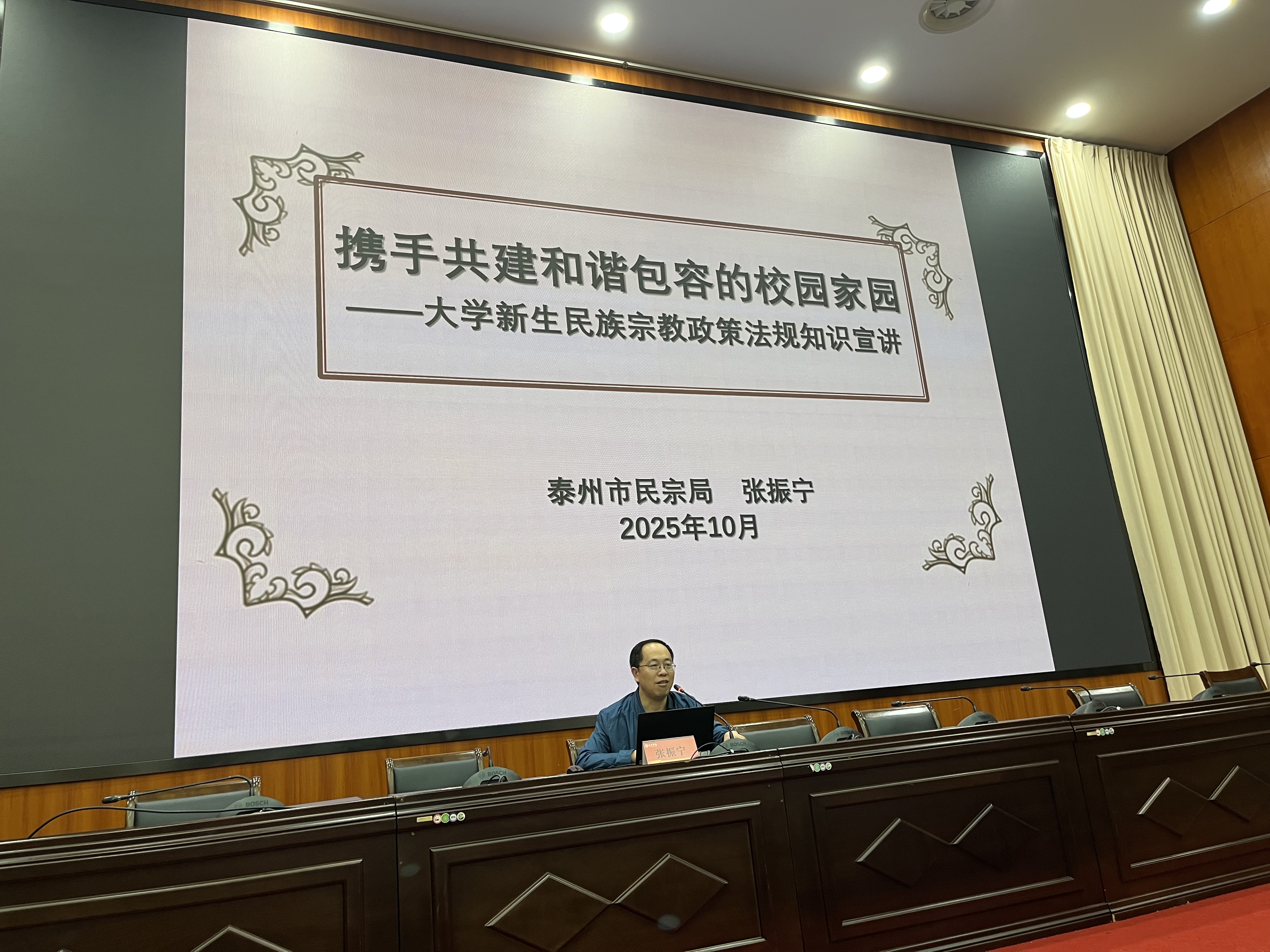 为深入学习贯彻习近平总书记关于加强和改进民族工作的重要思想、关于宗教工作的重要论述,进一步提升大学生对民族宗教政策法规的认识,全面推进铸牢中华民族共同体意识教育,自觉抵御境外利用宗教对高校进行渗透和防范校园传教,共同守护和创造和谐家园和校园。10月17日晚,泰州学院对2025年新生开设民族宗教政策宣讲会。泰州市民宗局民族处负责人、市爱国宗教团体管理中心助理研究员张振宁应邀作《携手共建和谐包容的校园家园》专题报告会。校党委统战部、学工处负责人,辅导员、新生代表近200人聆听了报告。